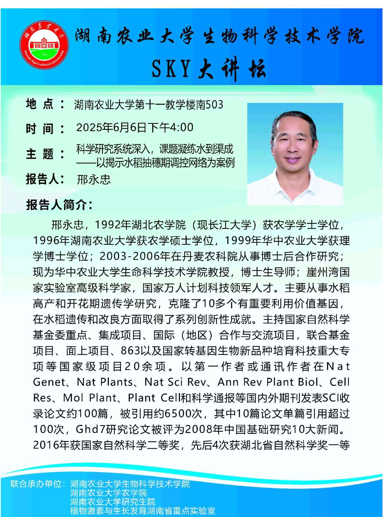 SKY大讲坛—科学研究系统深入,课题凝练水到渠成——以揭示水稻抽穗期调控网络为案例